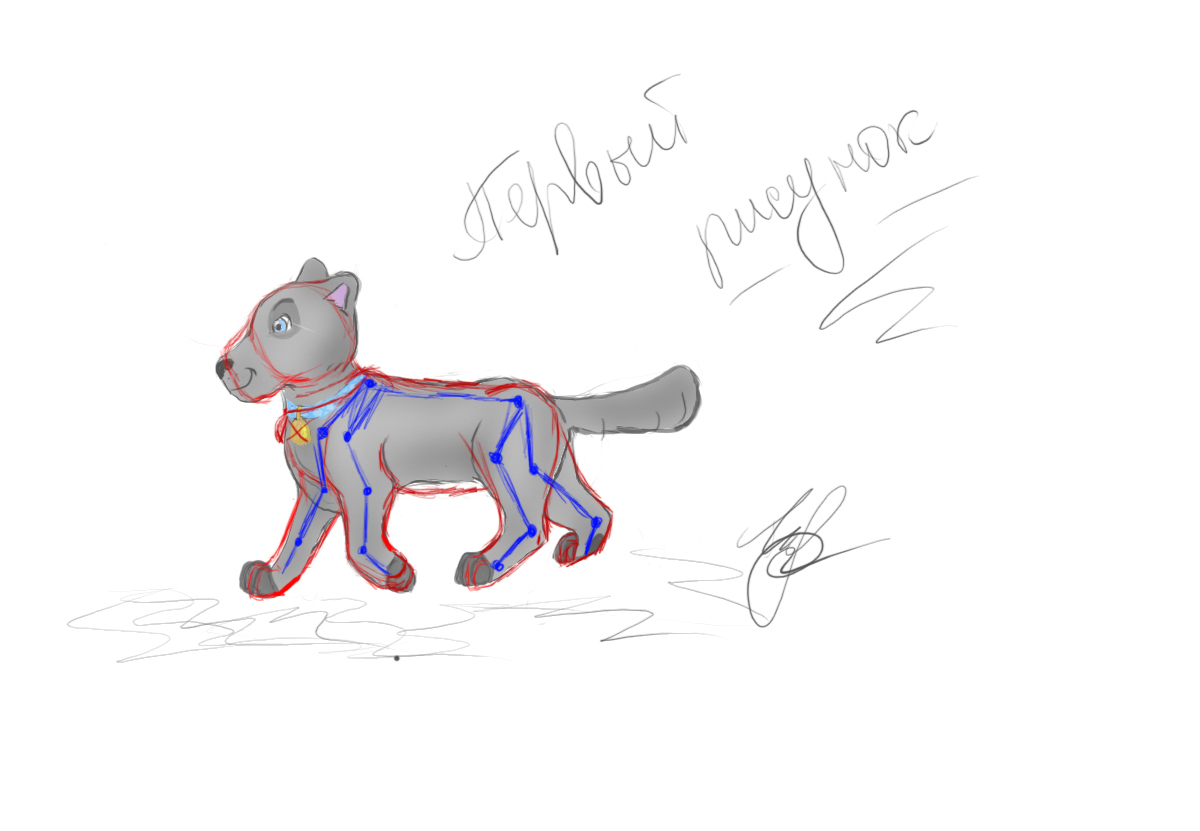 ничего страшного, если я накалякаю ? Синим я обозначила кости, красным - линии. Начнём слева направо. Если это львёнок (судя по лапам), то морда у него слишком длинная и резко опускается вниз (так не должно быть). И узковата немного. Насчёт ошейника - он не может так сильно провисать (аж до лопаток !) и кулон на нём в таком положении животного не был бы виден целиком, а только небольшая его часть прямо непосредственно на линии груди (если, конечно, кулон спереди а не сбоку). А если кулон плоский, то тогда была бы видна одна полоска. Шея коротковата, но на рисунке я не нашла способа её удлинить. Грудь очень большая, должна быть как минимум в два раза меньше. Сверху, между спиной и шеей, должна быть видна лопатка и линия лапы (красным обозначенная). Правая лапа животного (левая от зрителя) должна быть чуть потолще (даже я, наверное, тонкую сделала