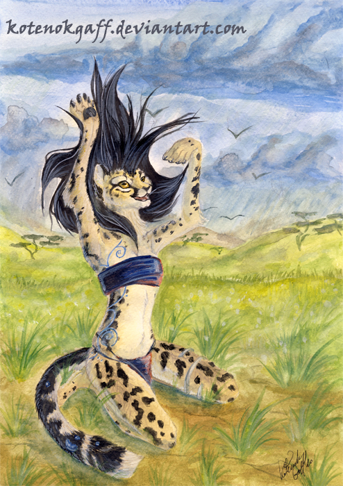 "Ритуал охоты" понравился больше "Вызова дождя" в первую очередь тем, что антропоморфность гепарда там совершенно не режет глаз - кажется вполне естественной. Удивительно даже. Плюс за счет темных тонов, фигур в дыме костра и бог его знает чего еще, атмосфера рисунка очень загадочна. Захватывает.