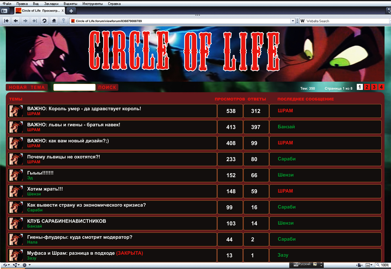Как оказалось, у львов тоже есть форум. Он хорошо известен африканским животным, а вот люди туда попадают редко. Форуму Circle of Life уже немало лет, модераторы неоднократно менялись (сейчас - Симба). Если покопаться в архивах форума, можно найти много интересного.