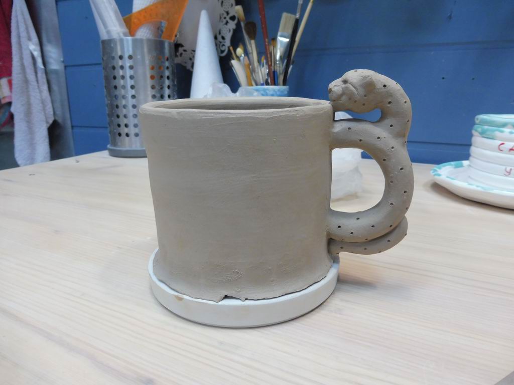 После свистульки решила, что стоит познакомиться с глиной поближе и попробовать сделать на гончарном круге кружку. Цилиндр получился не идеальным, но вполне цилиндрическим, к помощи мастера для этого не прибегала