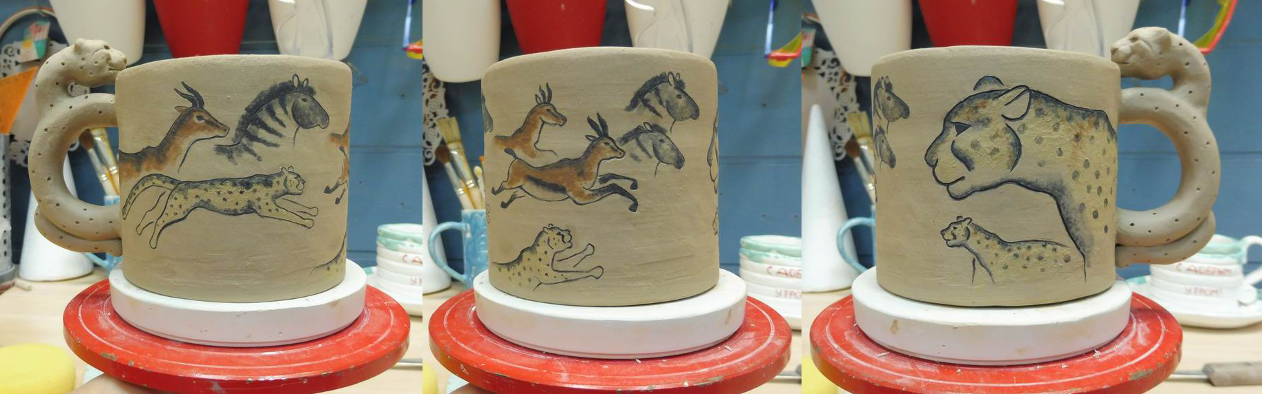 Кружка слегка подсохла, мя обработала некоторые места типа донышка, края и всякие локальные косячности. Потом ее можно было расписывать. Наброски у мяу были, но всю композицию и некоторые ее детали пришлось сочинять и модифицировать по ходу. Смешение стилей, конечно, страшное - цилиндрическая кружка, зооморфная ручка, наскальные рисунки.... После этого было длительное ожидание высыхания и обжига.