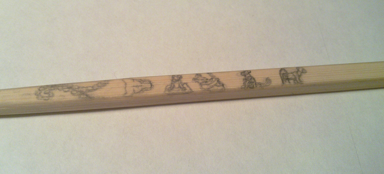нескольких экспериментов на ненужной палочке оказалось, что наилучшие результаты даёт простейшее рисование простым карандашом по дереву. Определившись с техникой, я стал подбирать рисунок. Перебрав несколько вариантов и отбросив их как нереализуемые, я остановился на том, чтобы рисовать на стэке пиктограммку каждой скульптуры, которая сделана с его помощью. То есть инструмент будет со временем меняться в зависимости от того, как его используют, и на нём будет явно записана его история. Вот что получилось: