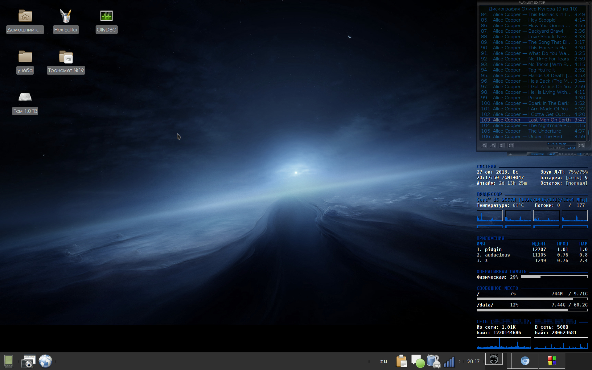 Вчера переустановил все три операционки, вот десктоп основной - elementary OS. Обои отсюда.