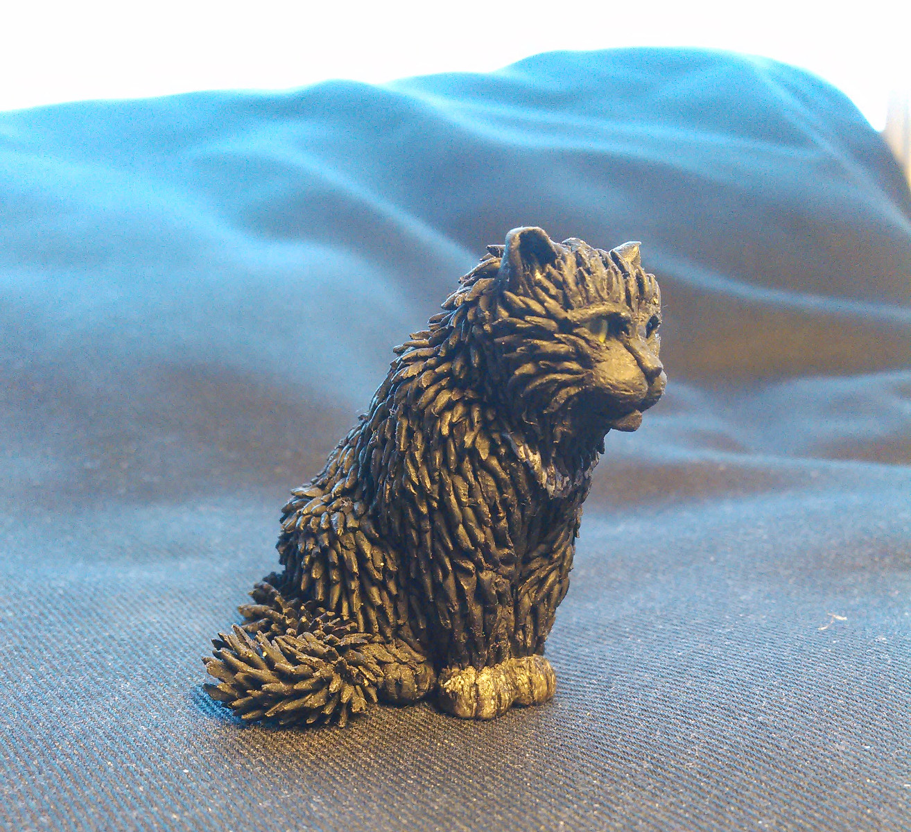 Сам кот слеплен из пигментированной полимерной глины, местами усилен проволокой от шампанского. Высота - 4см.