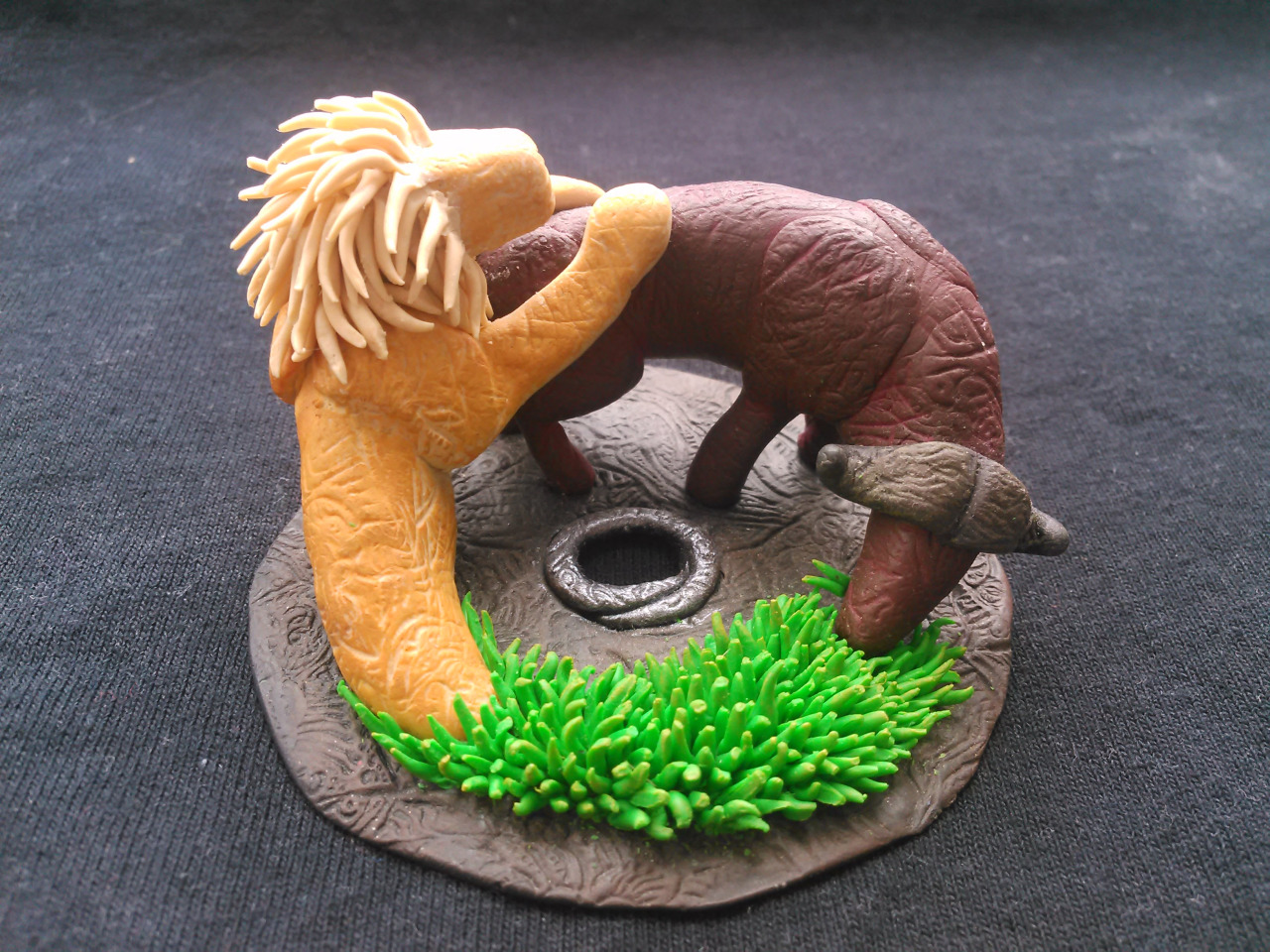 Тут пигментированная полимерная глина, акриловая краска и проволочки от шампанского внутри. На глину наложена текстура, после чего выступающие части покрашены сухой кистью, так что от цвета пластики остаются только прожилки. Обычно пластика в таком случае берётся более тёмной; я хотел посмотреть, что будет, если сделать наоборот. Везде по одному цвету покраски, за исключением рогов травоядного, где слоёв краски разных цветов аж три.
