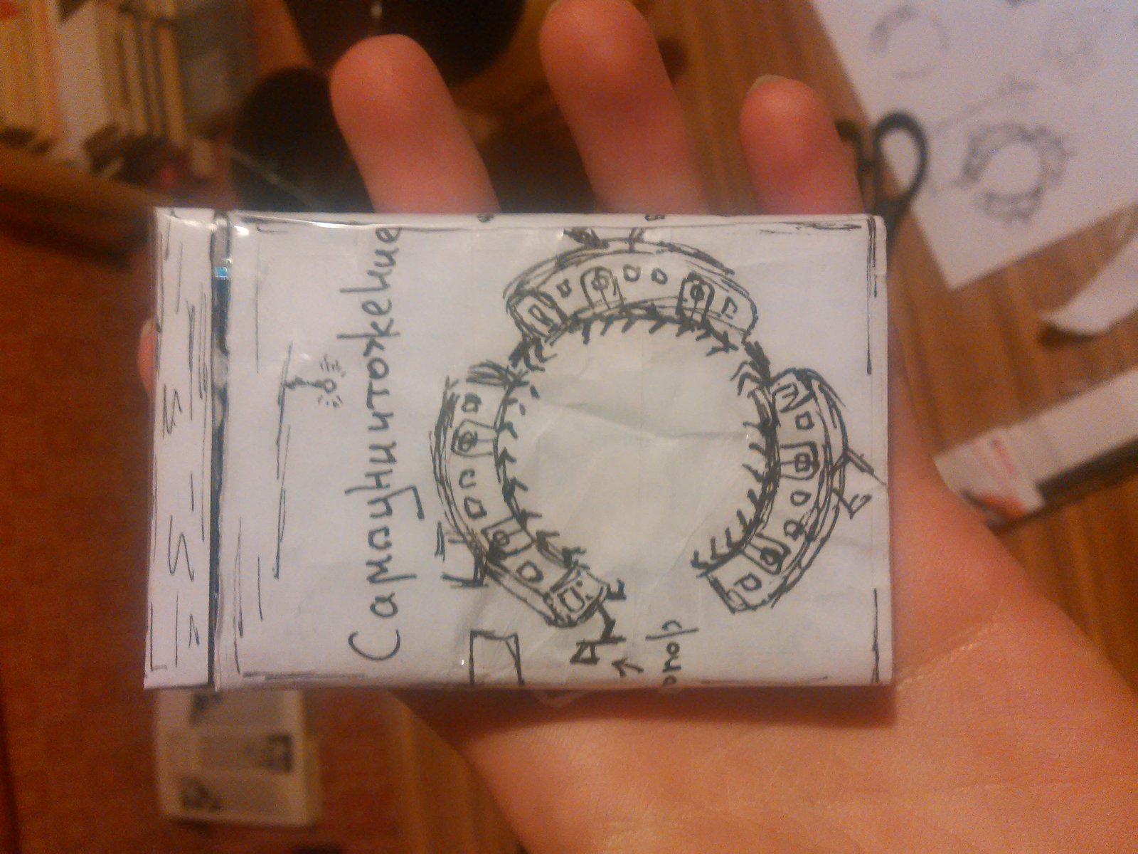 А сегодня ночью мы с получателем пуговиц сидели и обклеивали бумагой пачку из-под сигарет, тоже в подарок. Ещё до нас было подмечено, что стоит только раскурить сигарету на остановке, как к ней тут же подходит нужный трамвай (по закону подлости). Но из нас никто не курит, поэтому мы делаем специальную пачку для призыва трамваев, в которой лежат не сигареты, а скрученные рисунки. Даже если их сжигание трамвай не призовёт, хотя бы ждать его будет не так скучно.
