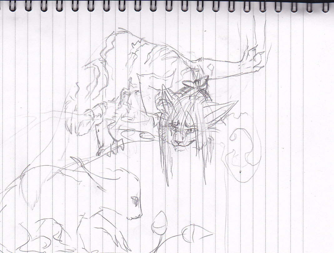 А я даже не знаю, что тут критиковать - композицию, персонажей, идею или еще что? если была бы конкретная просьба, вроде: "мне что-то не нравятся позы/анатомия персонажей, посоветуйте как сделать лучше?", ну или еще что-то, а так непонятно в чем вообще идея рисунка и как ты собираешься его рисовать дальше.